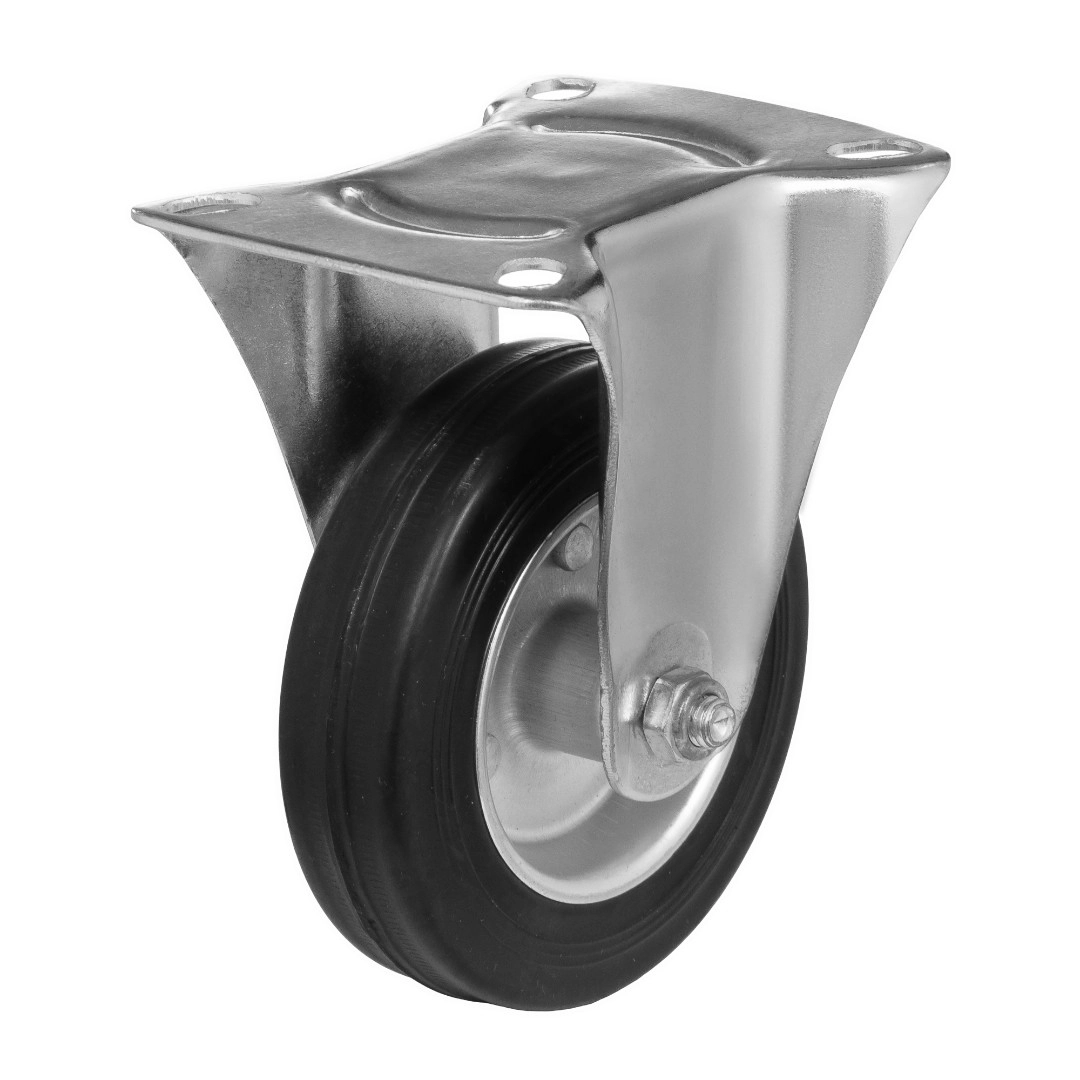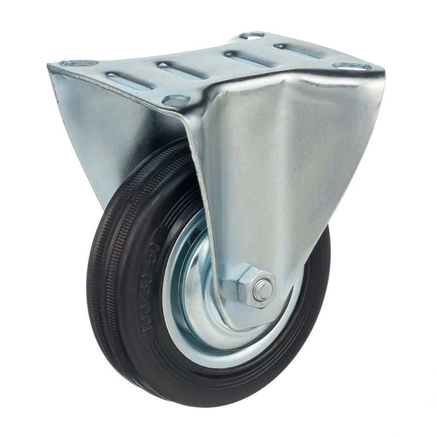 Колесо неповоротное 4002-100, диаметр 100мм., грузоподъемность 70кг. Колеса из черной литой резины, центр из двух гальванизированных дисков из штампованной стали. Роликовый (игольчатый) подшипник расположен в углублении, выдавленном под прессом, и содержит цилиндрические ролики подшипника. Неповоротный кронштейн изготовлен прессованием из листовой стали. Возможно применение на относительно грубых полах складов, заводов, производственных и строительных площадках. Данные колеса можно использовать на неровных поверхностях, во влажной окружающей среде и использования вне помещения. Не рекомендуется применять в среде с органическими растворителями, хлорированными веществами, гидрокарбонатами и минеральными маслами. Температура эксплуатации от -20 до +70С.
