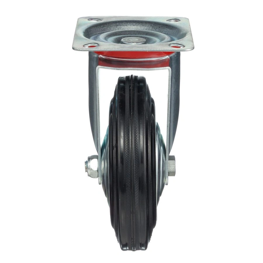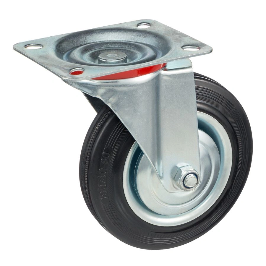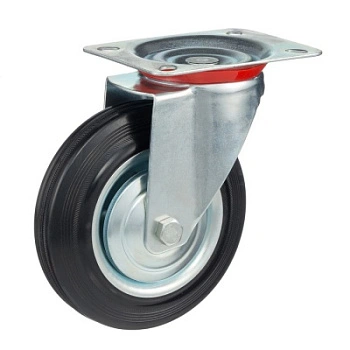 Колесо поворотное 4001-160, диаметр 160мм., грузоподъемность 145кг. Колеса из черной литой резины, центр из двух гальванизированных дисков из штампованной стали. Роликовый (игольчатый) подшипник расположен в углублении, выдавленном под прессом, и содержит цилиндрические ролики подшипника. Кронштейн изготовлен прессованием из листовой стали. В поворотном узле двухрядный шарикоподшипник. Возможно применение на относительно грубых полах складов, заводов, производственных и строительных площадках. Данные колеса можно использовать на неровных поверхностях, во влажной окружающей среде и использовании вне помещения, не рекомендуется применять в среде с органическими растворителями, хлорированными веществами, гидрокарбонатами и минеральными маслами. Температура эксплуатации от -20 до +70С.