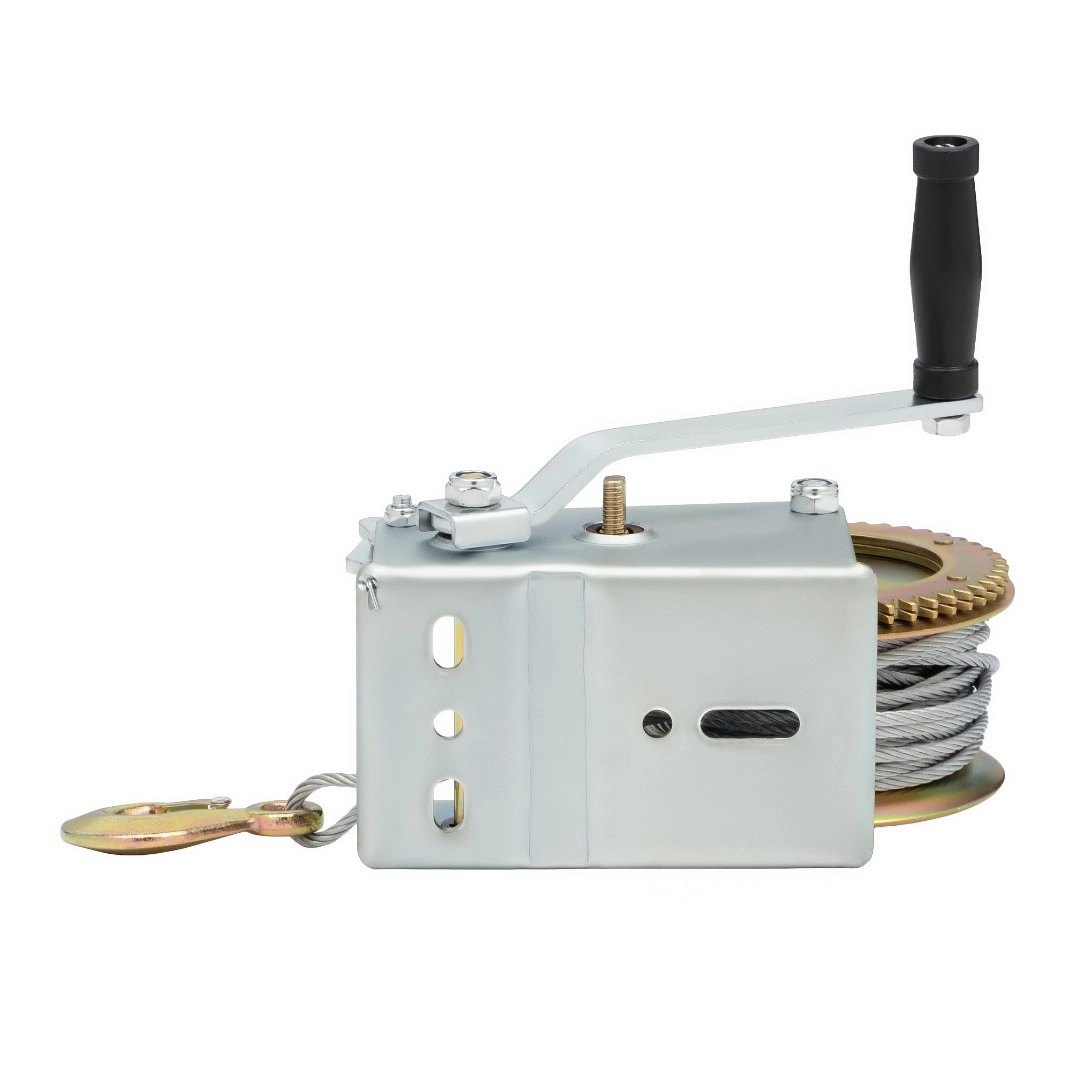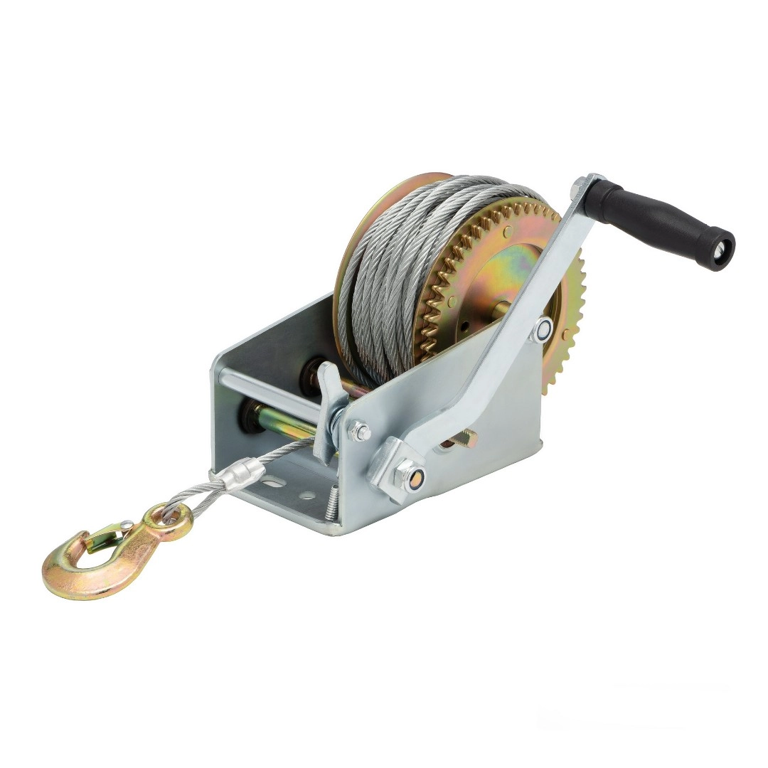 Барабанная ручная лебедка модели WH25-20 обеспечивает тяговое усилие до 1,1т., при длине троса 20м., диаметр троса 5,6мм. Ее применяют для разгрузки товаров в магазинах и на складах, в строительстве, на производстве и в быту. Стальной трос снабжен крюком с защелкой. Перемещение груза осуществляется за счет вращения ручки с пластиковой рукояткой. При отпущенной ручке автоматически срабатывает тормоз, что позволяет зафиксировать груз. Направление хода вперёд-назад. Тип передачи шестеренчатая (1 скорость). Габариты 250х160х180мм., вес 8,5кг.