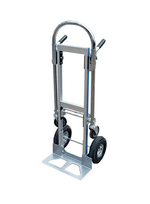 Тележка-трансформер КТ-2143 универсальна и предназначена для работы с разного рода грузами, не превышающими 200кг. (баллоны, бутыли, бочки и т. д.). Тележка КТ-2143 может использоваться как двухколесная тележка и при необходимости трансформируется в четырехколесную тележку. КТ-2143 имеет два пневматических колеса с металлическими дисками и два поворотных пластиковых. Благодаря двум пневматическим колесам и удобным ручкам, осуществляющим хороший захват, тележка может двигаться с минимальным сотрясением груза. Диаметр колес 2х260мм. (пневматические) и 2х125мм. Размер площадки в разобранном виде 950х305мм., в собранном виде 450х180мм.